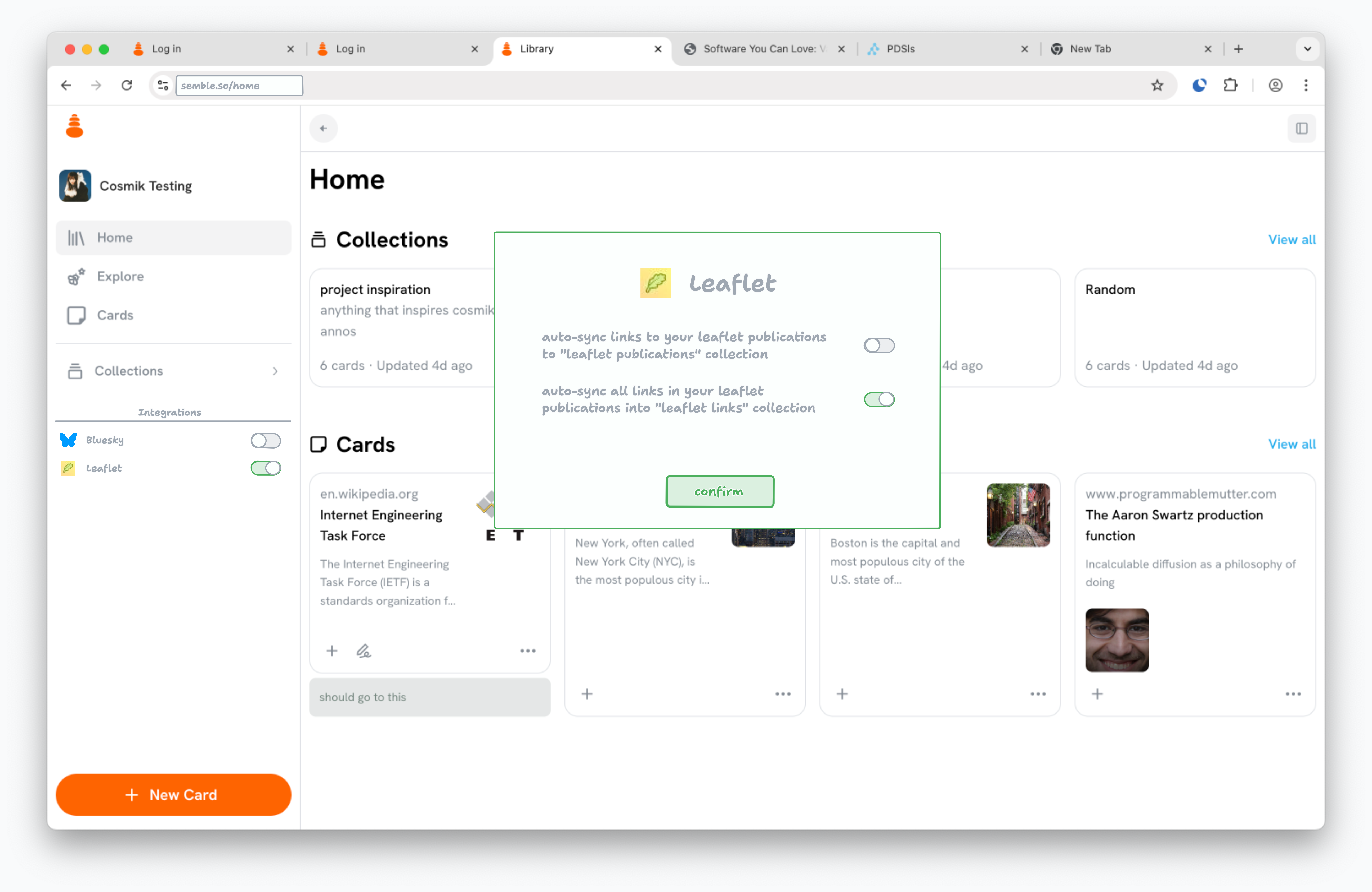 Above you can see an "integrations" section in the left panel. This is where different ATmosphere integrations can be added. When enabled, you get a few options (specific to the integration) about how to handle links. The examples here outline two options: automatically collecting your own leaflet publications into a special semble collections as well as automatically adding any link in your publications to another semble collection.