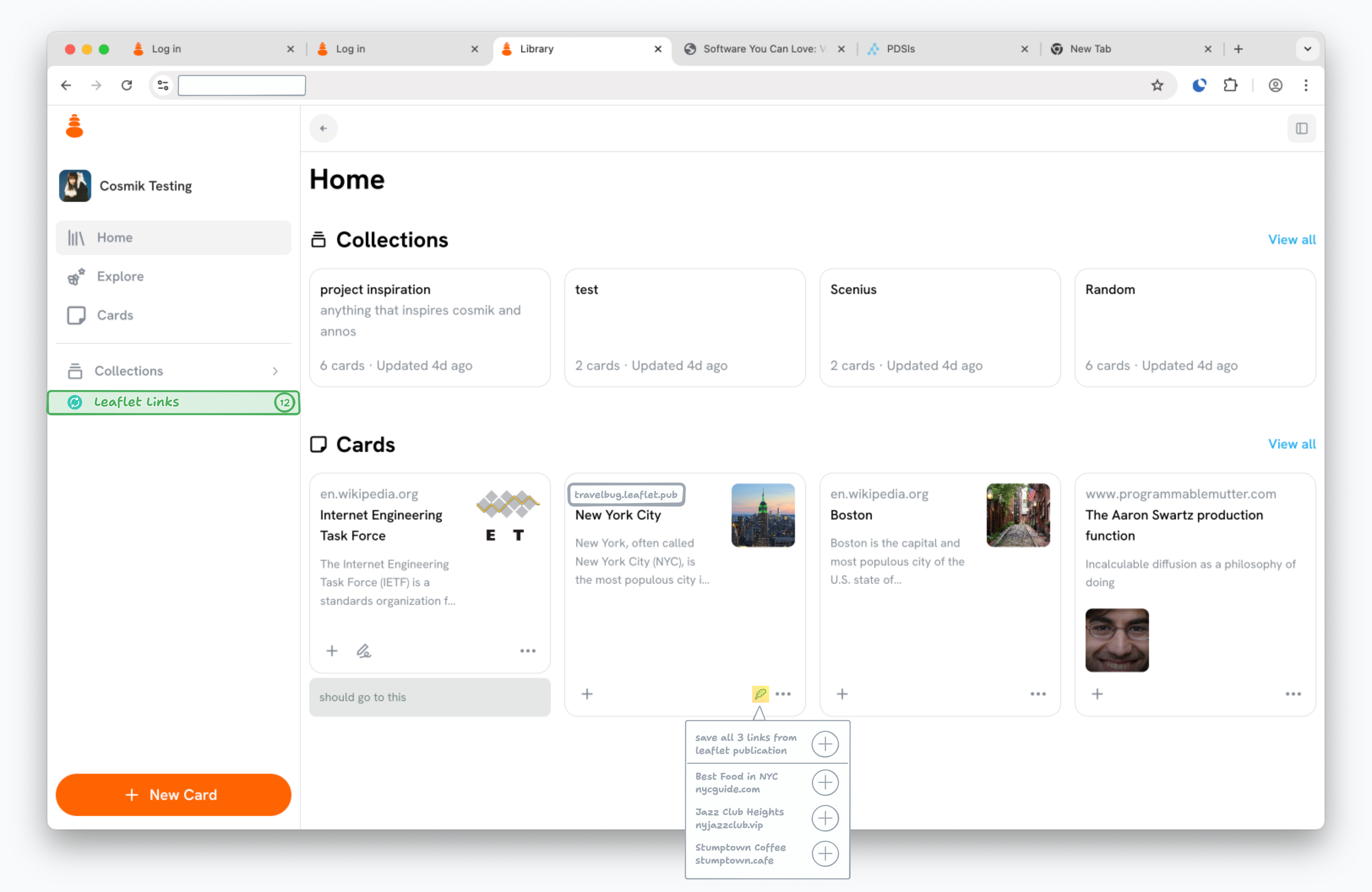 Some of us on the Cosmik Network team got to meet up with some of the Leaflet team on an exploratory call last week. Some of what we talked about were shared needs as builders of atproto apps as well as possible integrations between them.